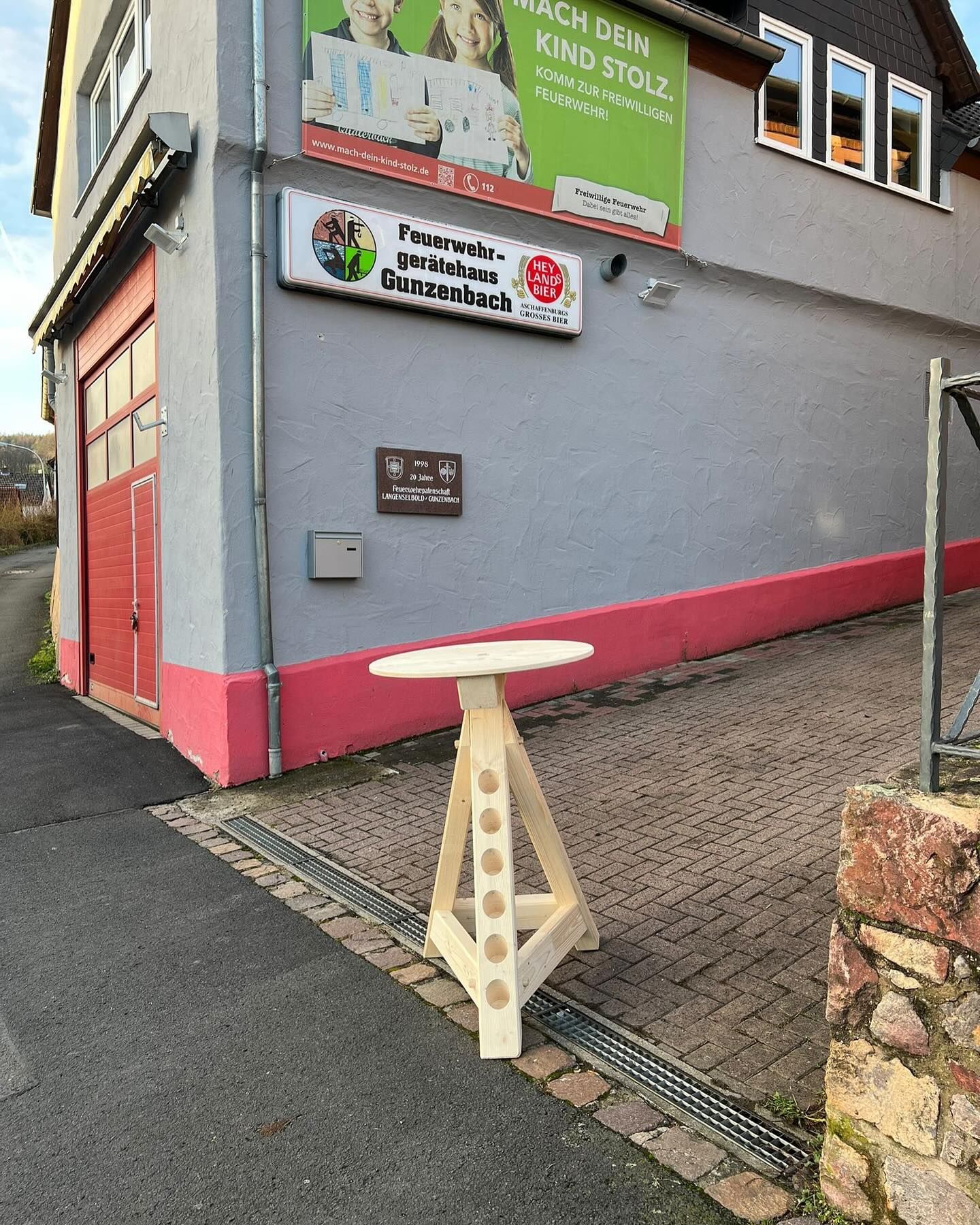 Die Zimmerei Wissel aus dem Gewerbegebiet Hutzelgrund hat uns für alle vier Feuerwehrhäuser einen selbstgebauten Holz-Stehtisch geschenkt. Der fünfte Tisch kann im Rahmen der Christbaumverlosung des Feuerwehrvereins Hohl gewonnen werden.